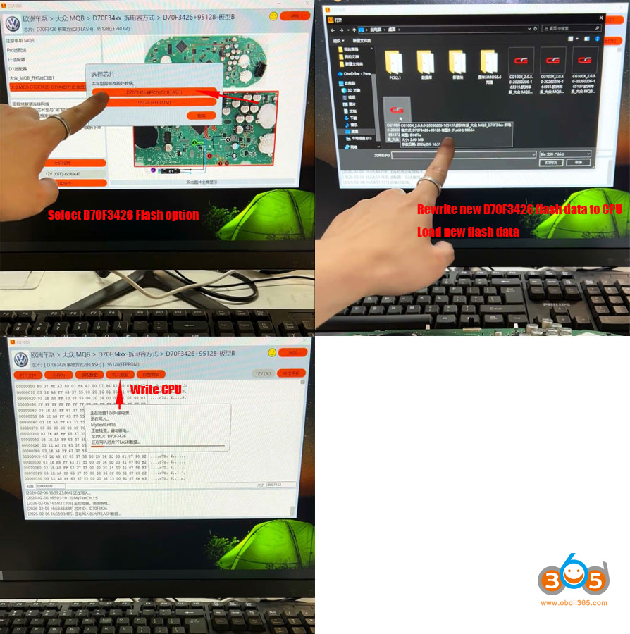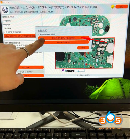 In CG100X software, select MQB- D70F34xx- Remove capacitor way- D70F3426+95128 Interface B.